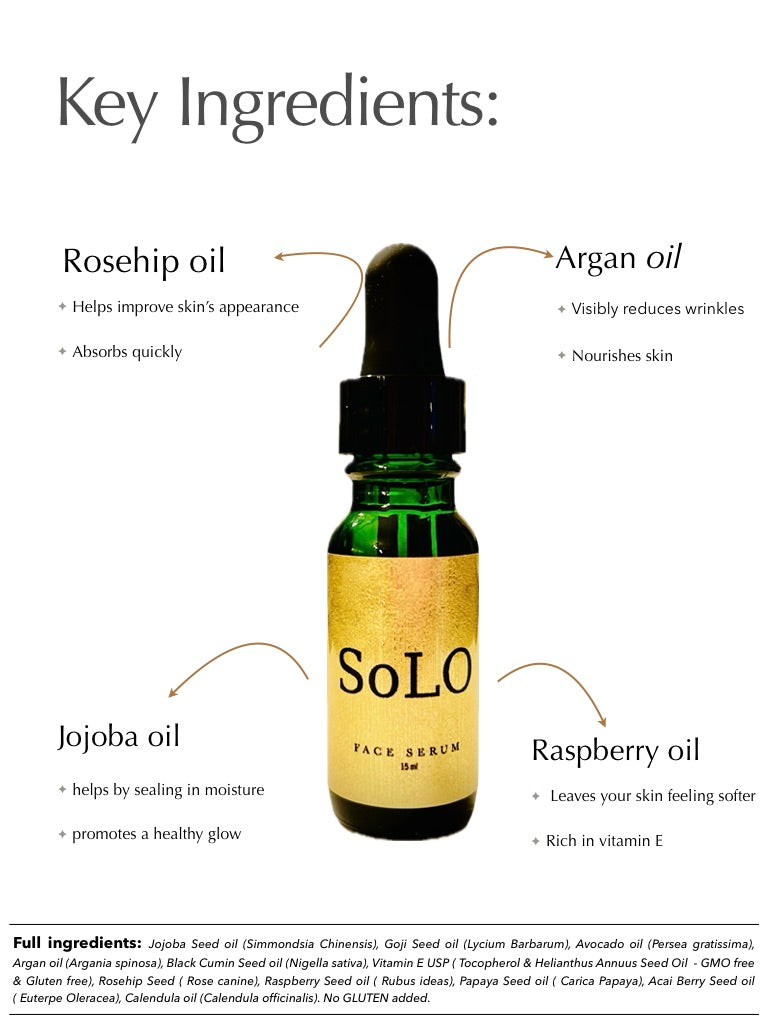 Our signature SoLO Face Serum is a luxurious blend of nature-powered ingredients designed to deeply hydrate and rejuvenate your skin. This lightweight yet potent formula helps support skin healing, improve texture, and enhance your natural glow.